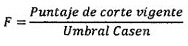 3.1.4 F: Factor de transformación monótona del instrumento para dejarlo en términos de puntaje. El valor F, según la fórmula que se indica más adelante, corresponde al cociente entre el puntaje de corte vigente para tener acceso a la PGU y el valor del umbral Casen, proporcionado en forma conjunta por el Ministerio del Trabajo y Previsión Social y el Ministerio de Hacienda.