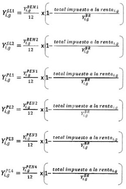 Luego la desagregación de los distintos componentes del ingreso líquido total (Yi,gSL e Yi,gPL), llevados a promedio mensual, se determinan con las siguientes fórmulas: