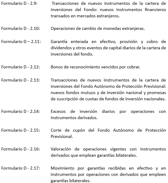 El informe diario está compuesto por un conjunto de datos codificados que deben ser proporcionados a la Superintendencia de Pensiones, a través de los siguientes formularios electrónicos, los que se adjuntan en el Anexo N° 1 de este Título: