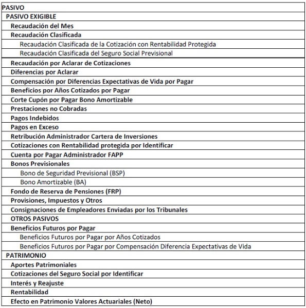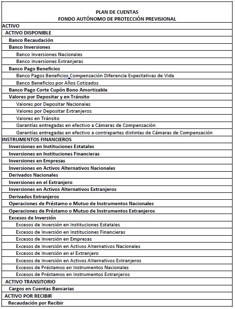 Libro IV Fondos de Pensiones y Regulación de Conflictos de Intereses > Título XII Del Fondo Autónomo de Protección Previsional > A. Normas Contables > Capítulo V. Plan de Cuentas del Fondo Autónomo de Protección Previsional