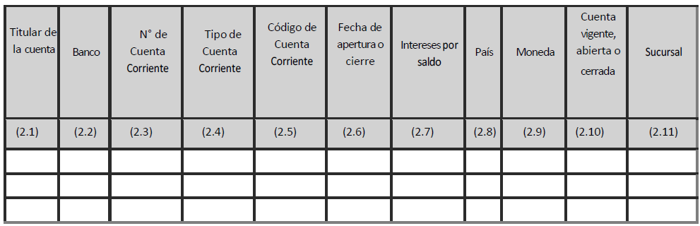 El formulario del listado de cuentas corrientes se compone de 11 columnas, en donde se deberá informar tanto las cuentas corrientes vigentes como las cuentas abiertas o cerradas durante el mes al que se refiere el informe. Dicho formulario debe ser completado de acuerdo con las instrucciones impartidas más adelante.