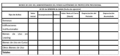 Se deberá presentar el detalle de los bienes de uso del Administrador del Fondo Autónomo de Protección Previsional desagregado por tipo de activo, indicando el valor de contabilización, los flujos de incorporaciones y retiros durante el período, el valor neto (stock) al cierre del ejercicio, así como la depreciación del período y la depreciación acumulada.
