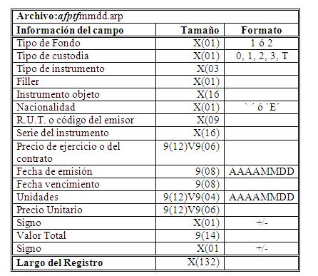 Libro IV Fondos de Pensiones y Regulación de Conflictos de Intereses > Título I Inversión de los Fondos de Pensiones, Políticas de Inversión y Solución de Conflictos de Interés > C. Inversión por Sociedades Anónimas cuyo Giro sea la Administración de Recursos Previsionales > Anexos > Anexo Nº 5 Especificaciones Técnicas para la Recepción de la Cartera de Inversiones de los Fondos de Pensiones