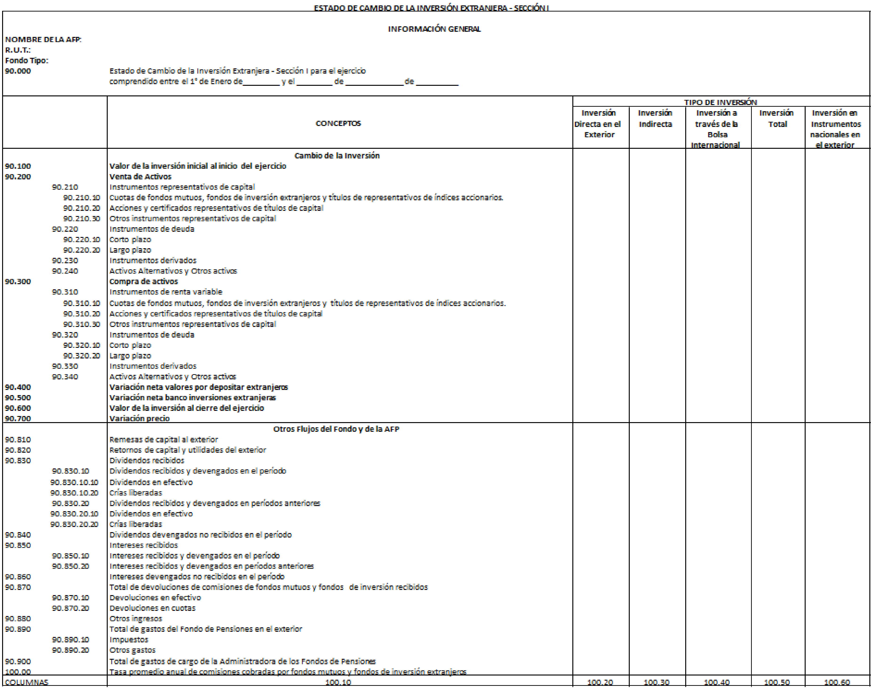 Libro IV Fondos de Pensiones y Regulación de Conflictos de Intereses > Título II Inversión de los Fondos de Pensiones en el extranjero > E. Estado de Cambio de la Inversión Extranjera de los Fondos de Pensiones > Anexos > Anexo Formato de Estado de cambio de Inversión en Instrumentos Extranjeros
