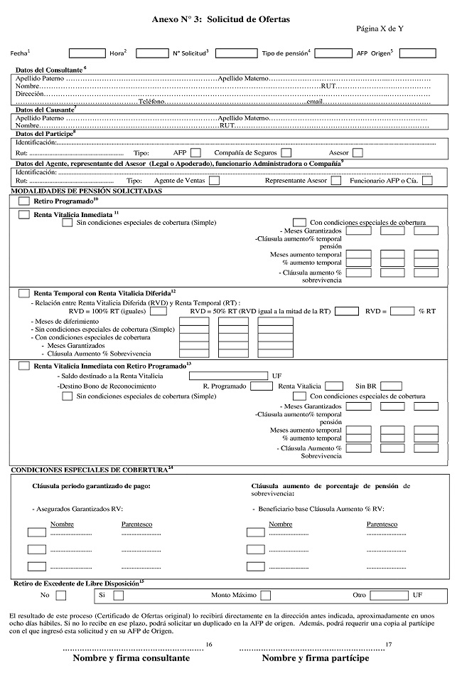 20. Al final de la primera página del formulario deberá incluirse, en mayúsculas de un tamaño de al menos 0,5 cms., la siguiente leyenda: "LEA CUIDADOSAMENTE LA INFORMACIÓN SOBRE MODALIDADES DE PENSIÓN Y CLÁUSULAS ADICIONALES ADJUNTA A ESTE FORMULARIO."