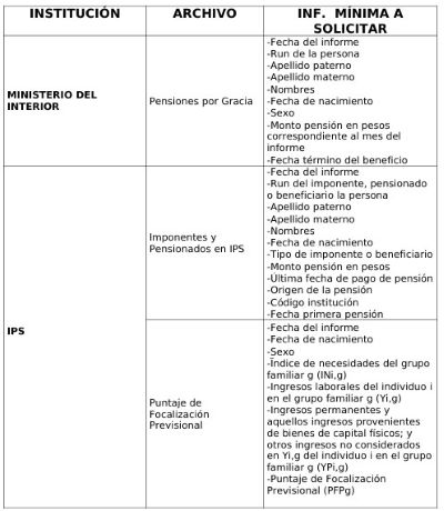 Adicionalmente, el IPS deberá solicitar como mínimo, la información que se detalla a continuación, asociada a la Institución que se indica en cada caso: