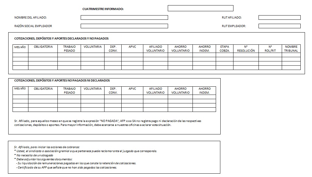 4. Las cotizaciones, depósitos o aportes declarados y no pagados deben registrarse por su monto en pesos nominal en la celda correspondiente al mes y concepto. En el caso de morosidad presunta (cotizaciones, depósitos o aportes no pagados ni declarados) que no se encuentre justificada con un aviso de cese de la relación laboral, la Administradora deberá incorporar en la celda correspondiente al mes y concepto la expresión NO PAGADA.
