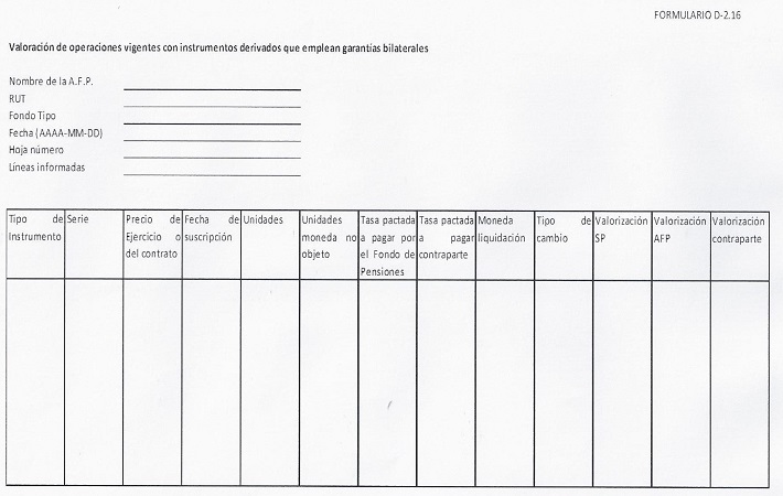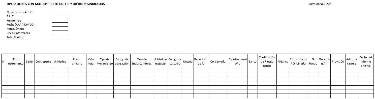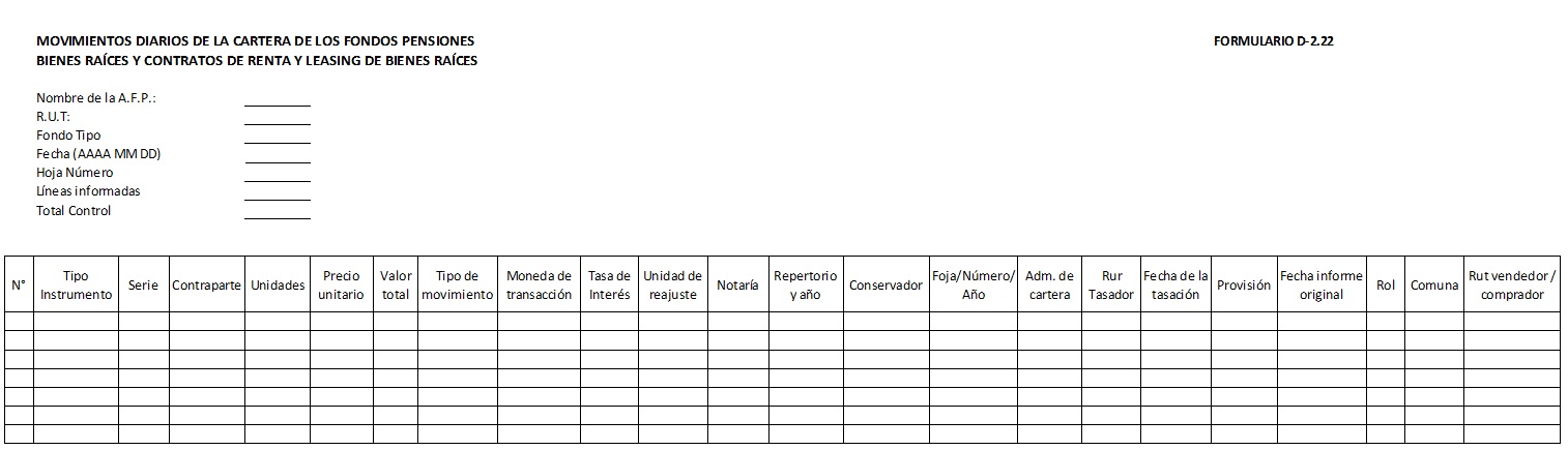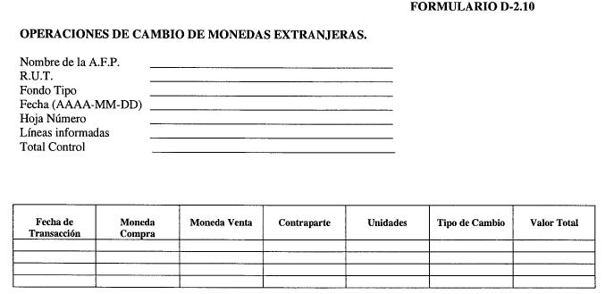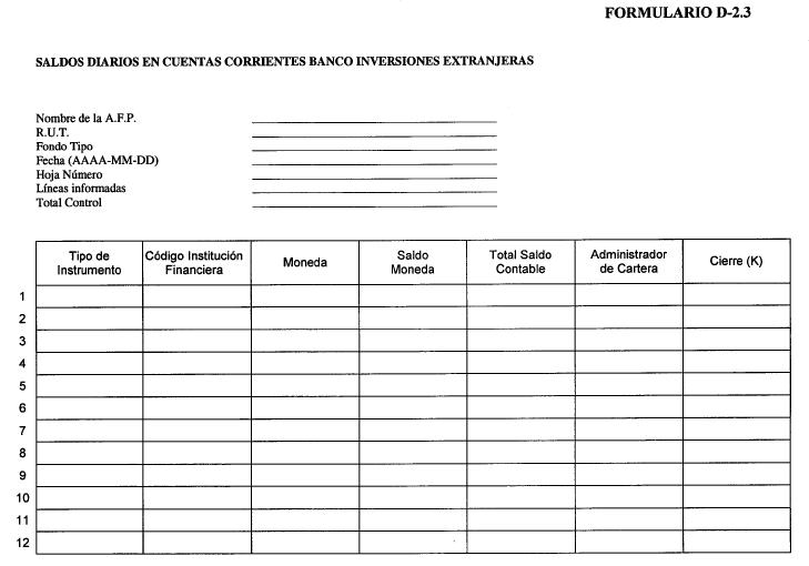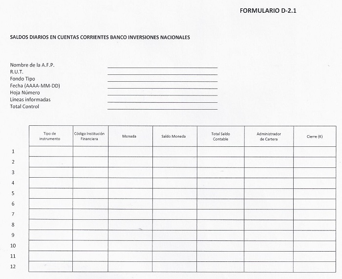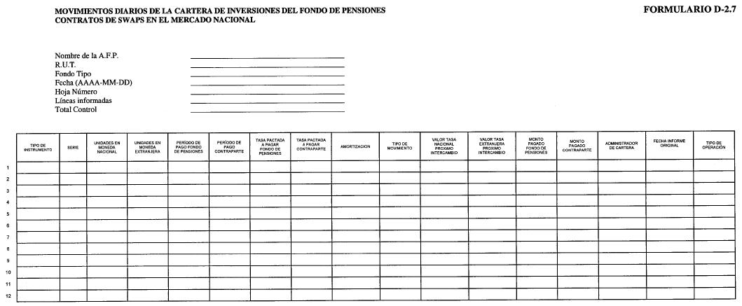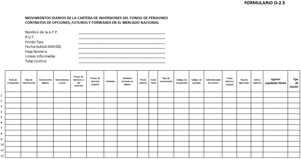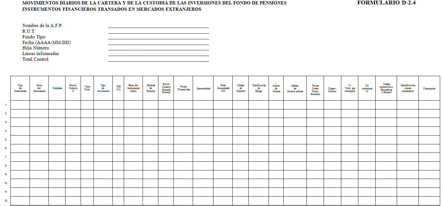 Libro IV Fondos de Pensiones y Regulación de Conflictos de Intereses > Título VIII Informes Diarios que deben presentar las Administradoras de Fondos de Pensiones > Anexos > Anexo Nº 1 Formularios del Informe Diario