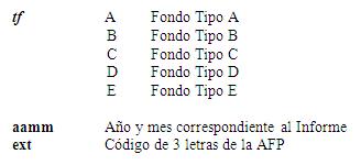 En cada archivo (uno por cada tipo de Fondo) se debe incluir 5 registros por cada una de las A.F.P. existentes, ordenadas alfabéticamente por nombre y a continuación 5 registros de totales por tipo de Fondo. La agrupación de 5 registros por cada A.F.P., corresponde a los tipos de Fondos existentes, ordenados alfabéticamente por tipo de Fondo.