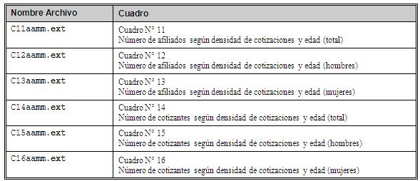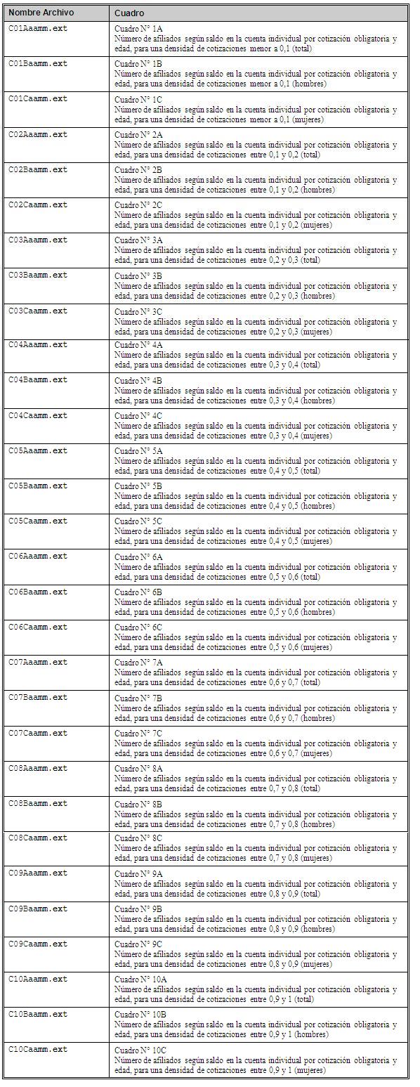 El Informe Estadístico Mensual de Afiliados y Cotizantes se compone de los archivos que a continuación se define. La siguiente es la nomenclatura utilizada en los nombres de los archivos: