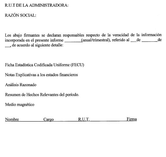 Libro IV Fondos de Pensiones y Regulación de Conflictos de Intereses > Título VII Contabilidad de los Fondos de Pensiones y de las Administradoras de Fondos de Pensiones > D. Informe Financiero de las Administradoras de Fondos de Pensiones y sus Sociedades Filiales, Memoria Anual, y determinación del Patrimonio Neto > Anexos > Anexo Nº 4 Declaración de Responsabilidad