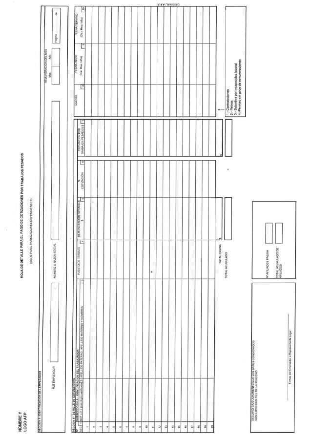 Libro II Cotizaciones Previsionales > Título I Cotizaciones y Aportes Previsionales por desempeño de Trabajos Pesados > Anexos > Anexo Nº 2 Hoja de detalle para el pago de Cotizaciones por Trabajos Pesados