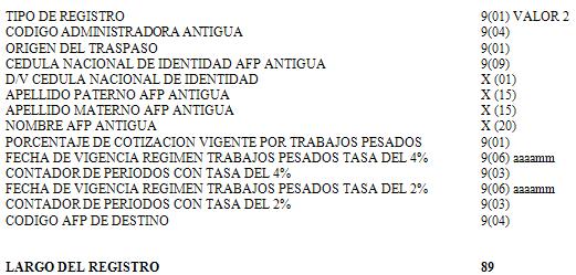 - Registro tipo 2: Detalle de la situación previsional de afiliados con trabajos pesados. Esta información corresponde al período de afiliación del trabajador en la administradora antigua y se incluirá un registro por cada afiliado traspasado.