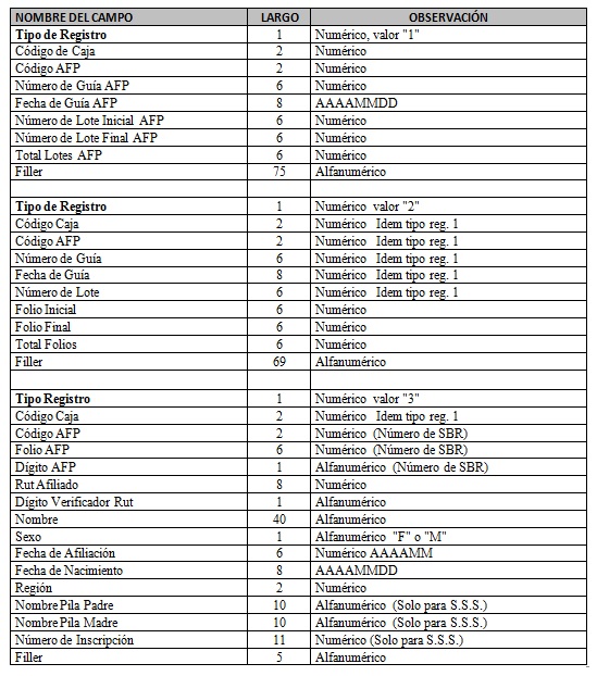 Libro III Beneficios Previsionales > Título III Bono de Reconocimiento > B. Tramitación del Bono de Reconocimiento > Anexos > Anexo Nº 3 Especificaciones de Registro para la Información Enviada al IPS por las AFP