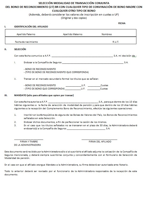 Libro III Beneficios Previsionales > Título III Bono de Reconocimiento > B. Tramitación del Bono de Reconocimiento > Anexos > Anexo Nº 7B Selección Modalidad de Transacción Conjunta del Bono de Reconocimiento (27) BR con cualquier Tipo de Combinación de Bono Madre con cualquier otro Tipo de Bono