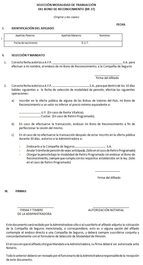 Libro III Beneficios Previsionales > Título III Bono de Reconocimiento > B. Tramitación del Bono de Reconocimiento > Anexos > Anexo Nº 7 Selección Modalidad de Transacción del Bono de Reconocimiento (BR 27)
