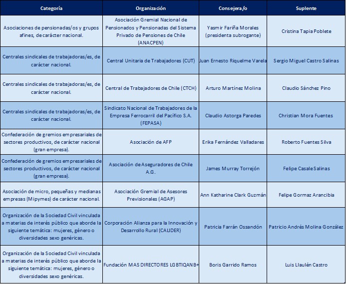 La siguiente es la nómina de integrantes del Consejo de la Superintendencia electas y electos para el período 2024-2026, acompañada de la resolución que aprueba la constitución de la instancia con la representación de las organizaciones de la sociedad civil y sus consejeras y consejeros, con fecha 21 de noviembre de 2024.