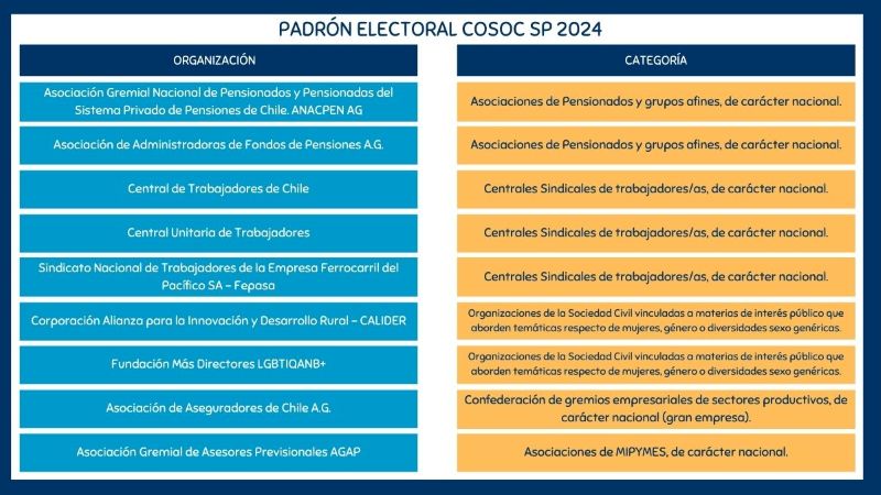 Podrán participar en la elección las organizaciones sin fines de lucro, representativas de la Sociedad Civil que se vinculen a la misión institucional de la Superintendencia de Pensiones que cumplan con los requisitos y que no presenten ninguna de las inhabilidades establecidas en el reglamento.